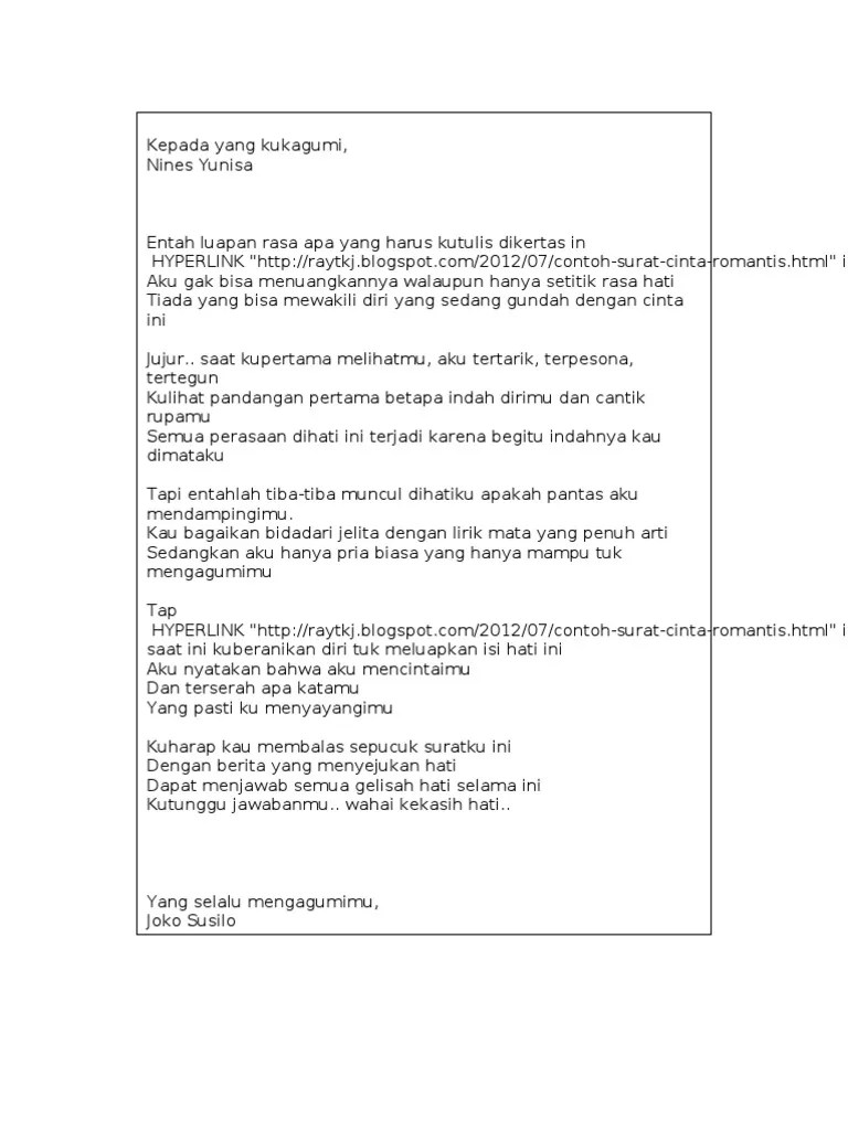 Surat Cintaku Yang Pertama Lirik - Cerpen Surat Cinta Untuk Starla Coretan - Bagai bingkisan pertama.tak sabar ku buka reff: e b e a satu dua dan tiga.a…kumulai membaca.. Esepucuk surat yang manis… war bnanya pun merah hati c#mbagai bingkisan pertama. B e surat cintaku yang pertama b e membikin hatiku berlomba b g#/c c#m seperti melody yang indah.ha. * surat cintaku yang pertama. Lirik lagu 'surat cinta' menceritakan kegembiraan seseorang ketika pertama kali menerima surat cinta. Sepucuk surat yang maniswarnanya pun merah hatibagai .